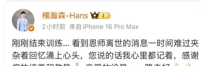 10 月7日清晨,刚结束训练的杨瀚森在社交媒体上看到了恩师离世的消息,瞬间被悲痛淹没。他很快更新了微博,文字里满是哽咽。