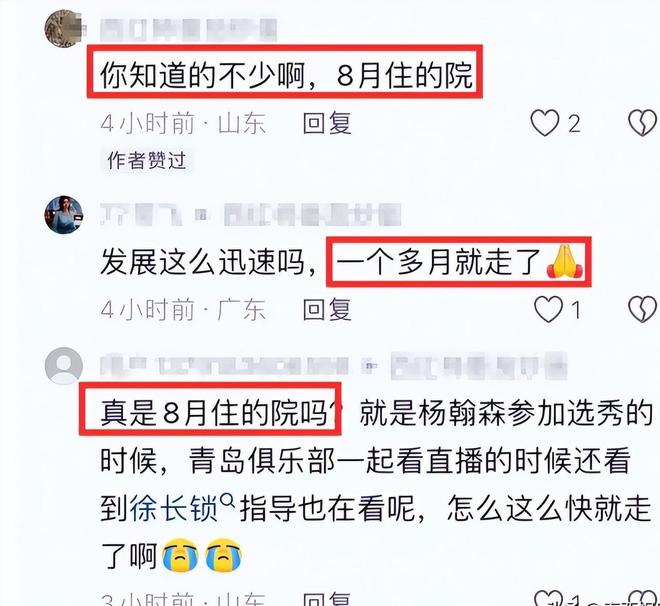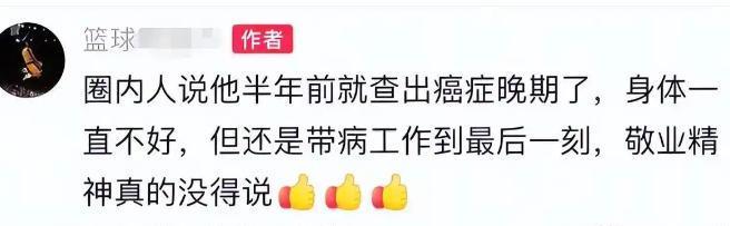 评论区内,还有圈内人爆料称,确诊后的这半年,徐长锁几乎是在训练馆和医院之间连轴转。即便身体已经发出警报,他还是放不下球队的训练和青训的规划,常常输完液就直奔球场。