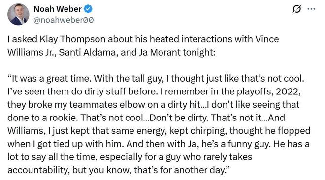 克莱提到的肮脏动作是22年勇士季后赛对阵灰熊,小佩顿上篮时被当时还效力于灰熊队的狄龙拉拽倒地,并在空中被狄龙打到头部,狄龙当场吃到二级恶犯被驱逐,小佩顿则遭遇手臂骨折。