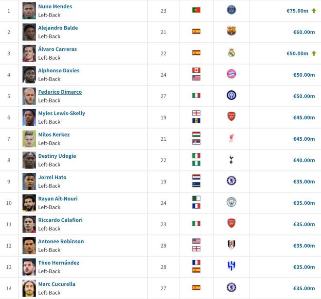 身价上涨500万欧,努诺-门德斯7500万欧继续领跑左后卫身价榜