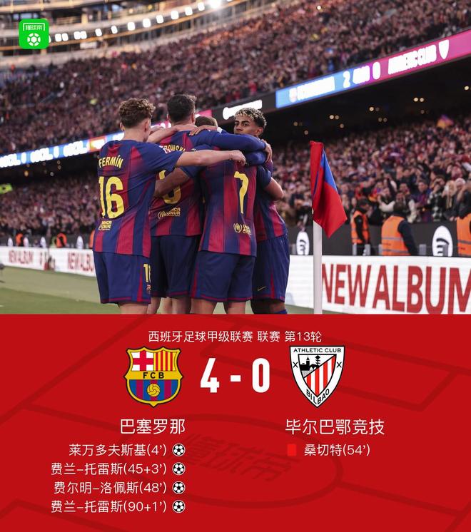 北京时间11月22日,西班牙足球甲级联赛第13轮展开较量,巴塞罗那主场迎战毕尔巴鄂竞技。比赛伊始,莱万多夫斯基率先破门,为巴塞罗那取得领先。上半场补时阶段,亚马尔送出助攻,费兰-托雷斯推射入网,进一步扩大比分。易边再战,费尔明-洛佩斯接应进攻打入第三球,帮助球队巩固优势。随后,毕尔巴鄂竞技球员桑切特被红牌罚下,客队陷入人数劣势。下半场补时阶段,费兰-托雷斯再度破门,完成梅开二度。最终,巴塞罗那以4比0战胜毕尔巴鄂竞技。