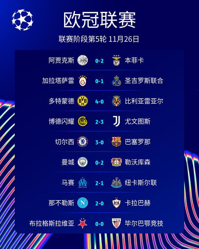 至此,本赛季欧冠联赛阶段第5轮首日9场比赛战罢,结果分别为:阿贾克斯0-2本菲卡、加拉塔萨雷0-1圣吉罗斯联合、多特蒙德4-0比利亚雷亚尔、博德闪耀2-3尤文图斯、切尔西3-0巴塞罗那、曼城0-2勒沃库森、马赛2-1纽卡斯尔联、那不勒斯2-0卡拉巴赫、布拉格斯拉维亚0-0毕尔巴鄂竞技。